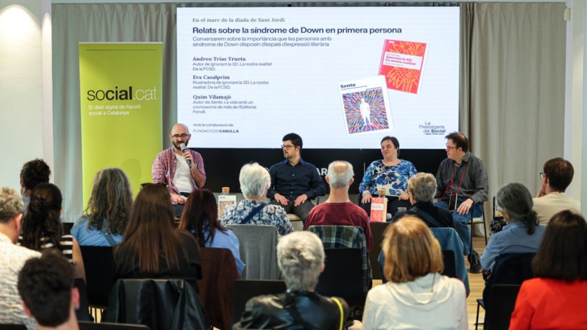 Con estos invitados se ha dado el pistoletazo de salida a la sexta edición de La Estantería de lo Socialla iniciativa del Social.cat para generar debates participativos a través de los libros sociales y sus autoras y autores. Este martes se ha abierto el ciclo de charlas hablando sobre expresión literaria en personas con síndrome de Down, de la mano de Quim Vilamajó, autor de Siento. La vida con un cromosoma más (Fonoll), Andreu Trias Trueta, autor deIgnorando el SD: nuestra realidad (FCSD) y Eva Casalprim, ilustradora del libro.