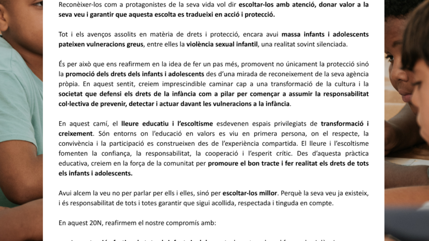 En este camino, el ocio educativo y el escultismo se convierten en espacios privilegiados de transformación y crecimiento. Son entornos en los que la educación en valores se vive en primera persona, donde el respeto, la convivencia y la participación se construyen desde la experiencia compartida. El ocio y el escultismo fomentan la confianza, la responsabilidad, la cooperación y el espíritu crítico. Desde esta práctica educativa, creemos en la fuerza de la comunidad por promover el buen trato y hacer realidad los derechos de todos los niños y niñas y adolescentes.
