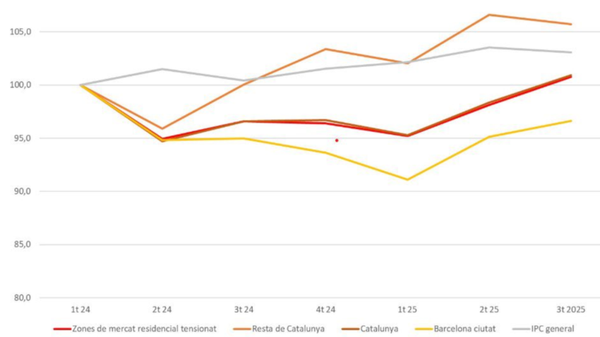 Los nuevos datos del precio del alquiler (3r trim 2025) muestran una subida de 2,7% respecto al trimestre anterior en las zonas de mercado residencial tensionado. Esta subida es más leve (1,5%) en la ciudad de Barcelona.