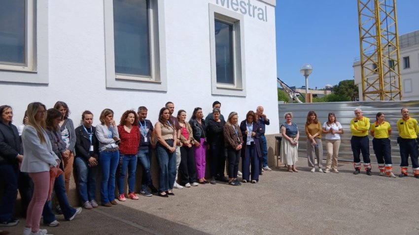 Profesionales que trabajan en el edificio Mestral del Parque Sanitario Pere Virgili de Barcelona han hecho acto de presencia en este minuto de silencio a las puertas del edificio.