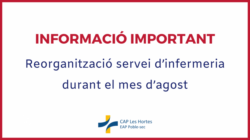 A partir del día 4 de agosto y hasta el día 29 del mismo mes, las visitas programadas de enfermería se realizarán todas en la 1ª planta, en las consultas 3 y 13. En caso de programarse el mismo día como urgencia de enfermería, será atendida en la consulta 3 de la planta baja. En el momento de la programación de la visita se informará a la persona el lugar de la visita.