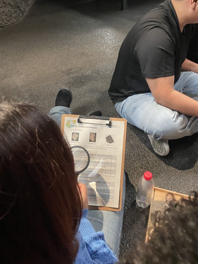 Durante la visita, las educadoras Joana e Irene dinamizaron el taller En construcciónque permitió al alumnado descubrir el ciclo de las rocas, identificar sus diferentes tipos y entender cómo los agentes internos y externos moldean el relieve de nuestro planeta. El taller fue muy participativo: a partir de muestras reales y de la exposición, los grupos investigaron, debatieron y se convirtieron en expertos en un tema concreto, que después compartieron con el resto de compañeros y compañeras mediante explicaciones orales y materiales visuales.
