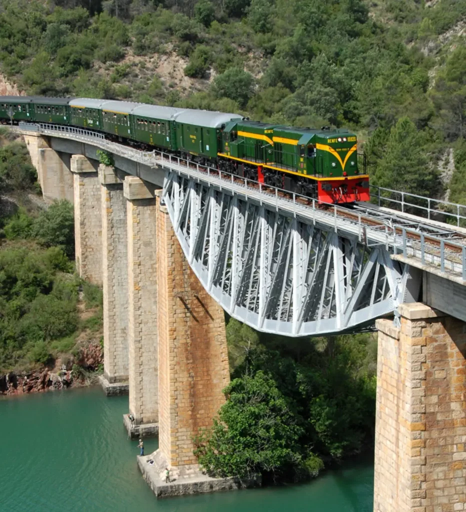 Al largo de sus aproximadamente dos horas de trayecto, el tren cruza 4 lagos, 40 túnelas y 75 puentessiempre con un guía turístico a bordo que explica el recorrido y la historia de este tren histórico gestionado por Ferrocarrils de la Generalitat de Catalunya (FGC).